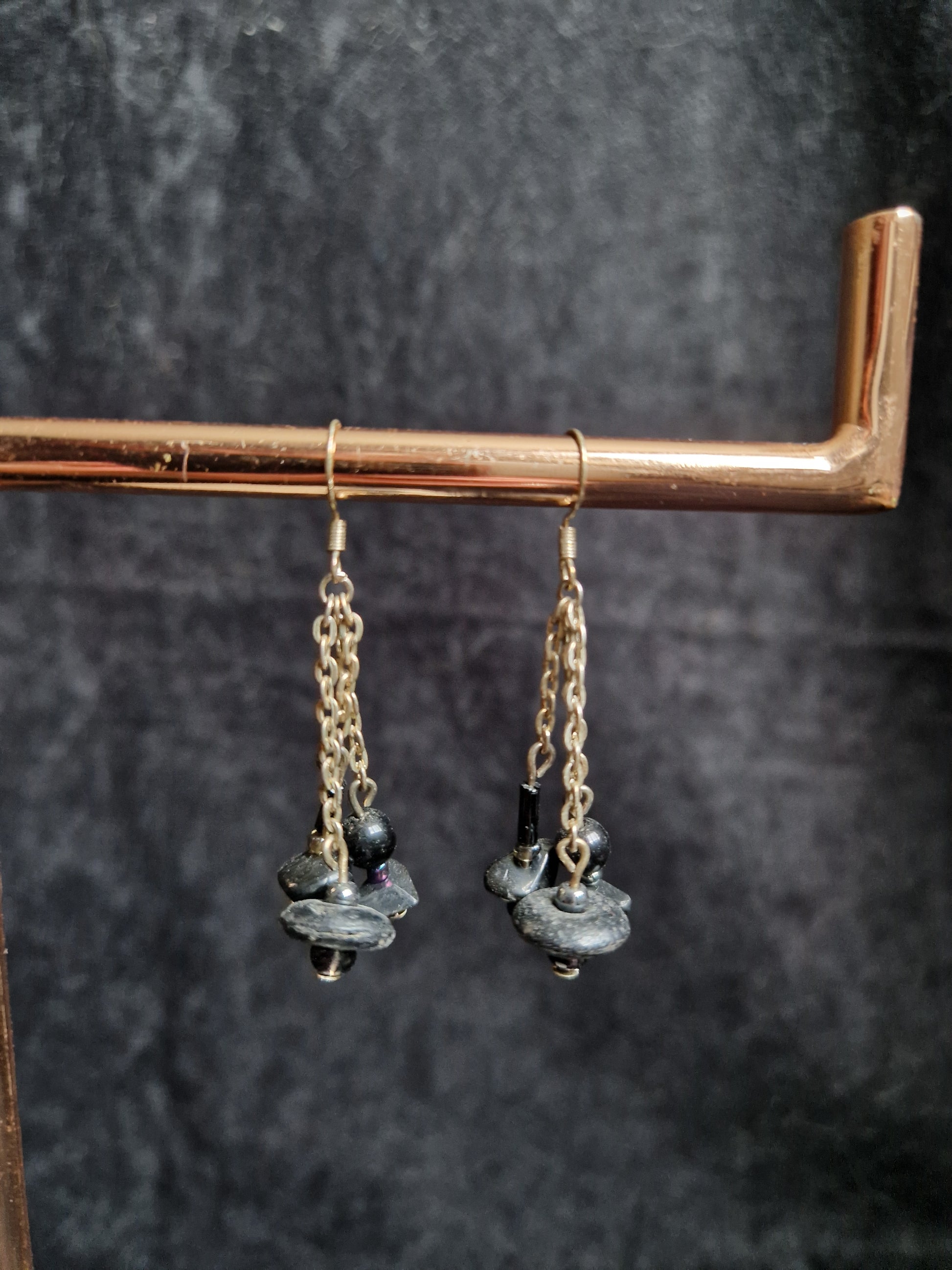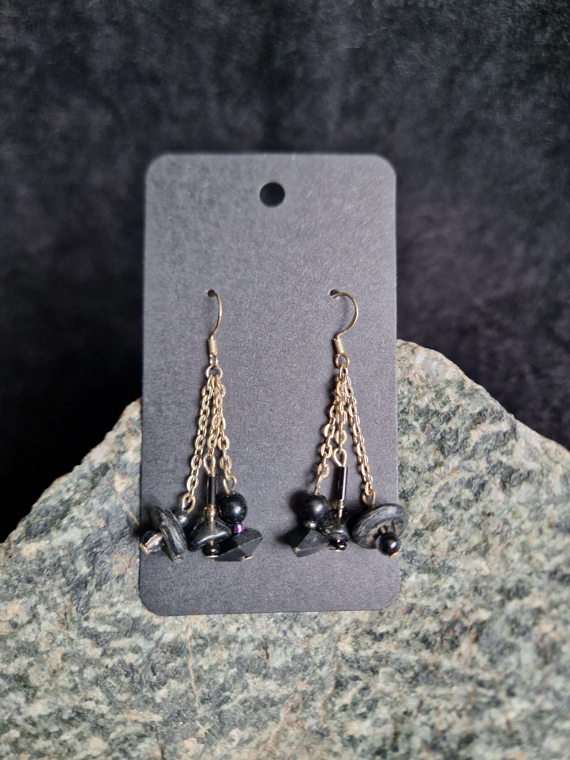Unique black dangly earrings made with a selection of glass, wood and plastic beads, with obsidian stone chips on triple strand chains with silver earring hooks.