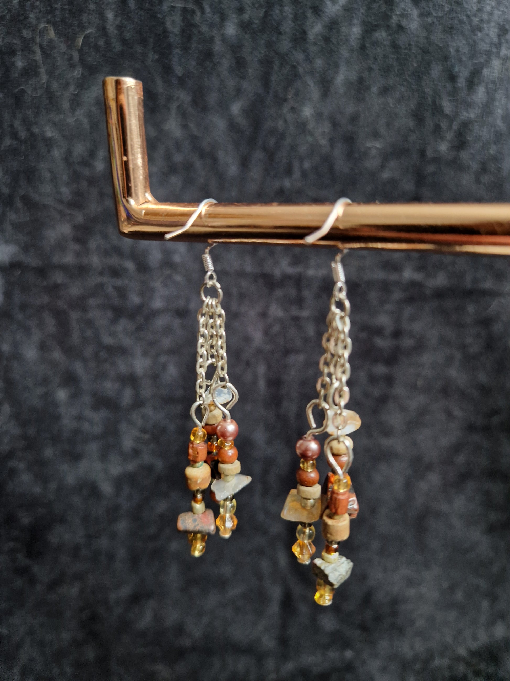 Unique natural dangly earrings made with a selection of glass, wood and plastic beads, with mahogany obsidian, citrine and pink zebra jasper stone chips on triple strand chains with silver earring hooks.
