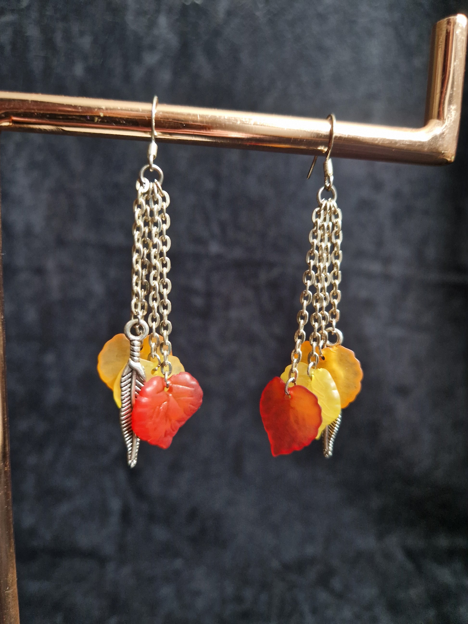 Unique dangly chain earrings made with red, orange and yellow plastic and metal leaf charms on silver earring hooks.