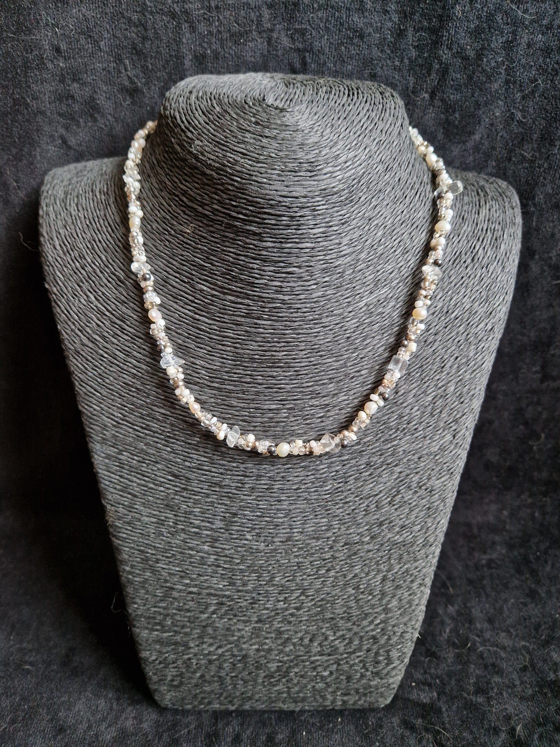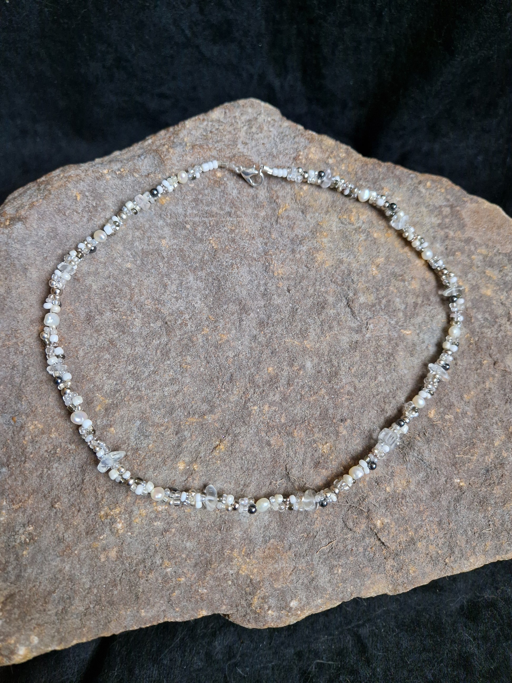 This unique necklace combines over 500 individually threaded silver-plated, glass, metal and plastic beads with freshwater pearls and quartz stone chips.