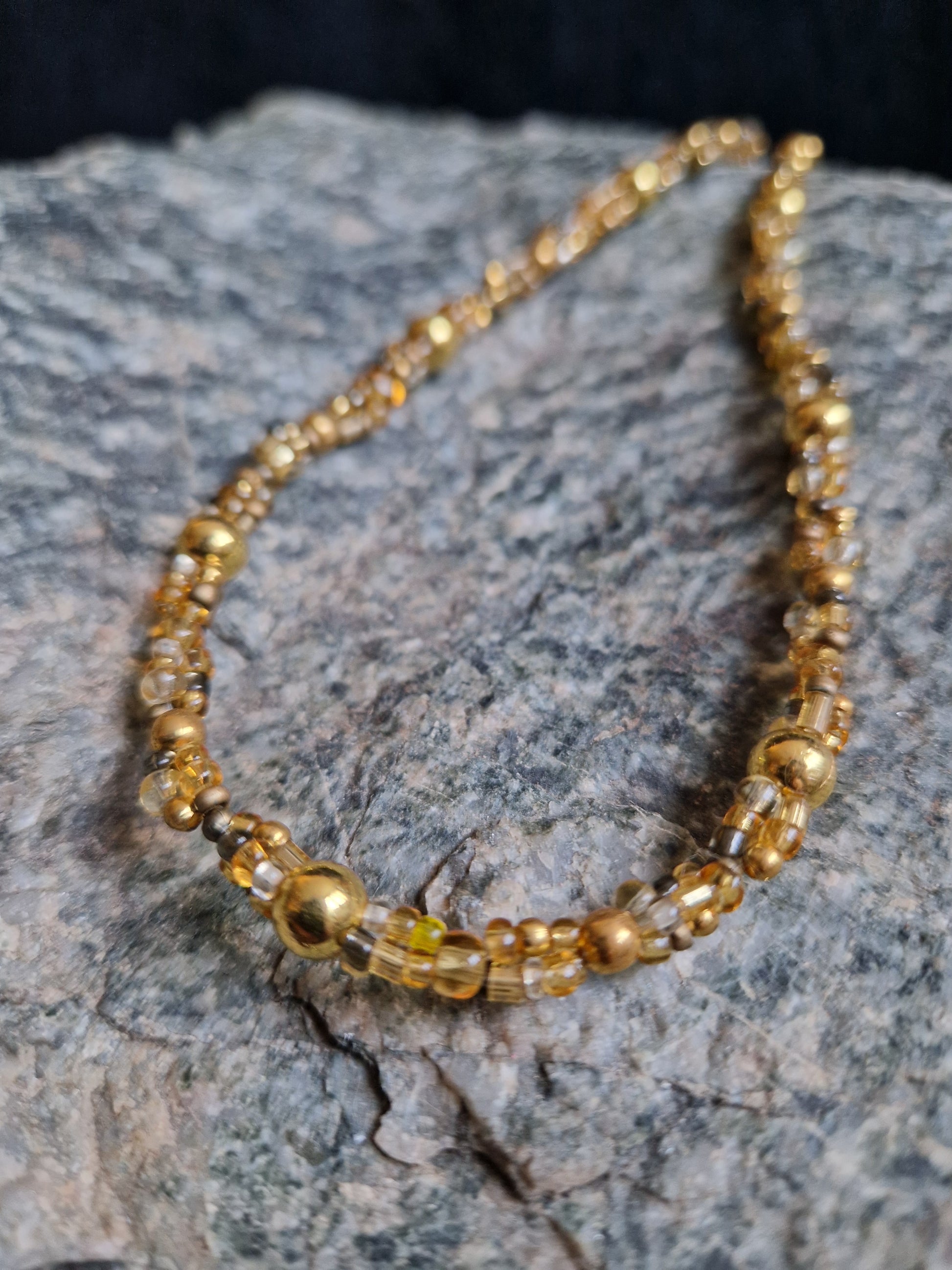 This unique necklace combines over 500 individually threaded gold-plated, glass and plastic beads.