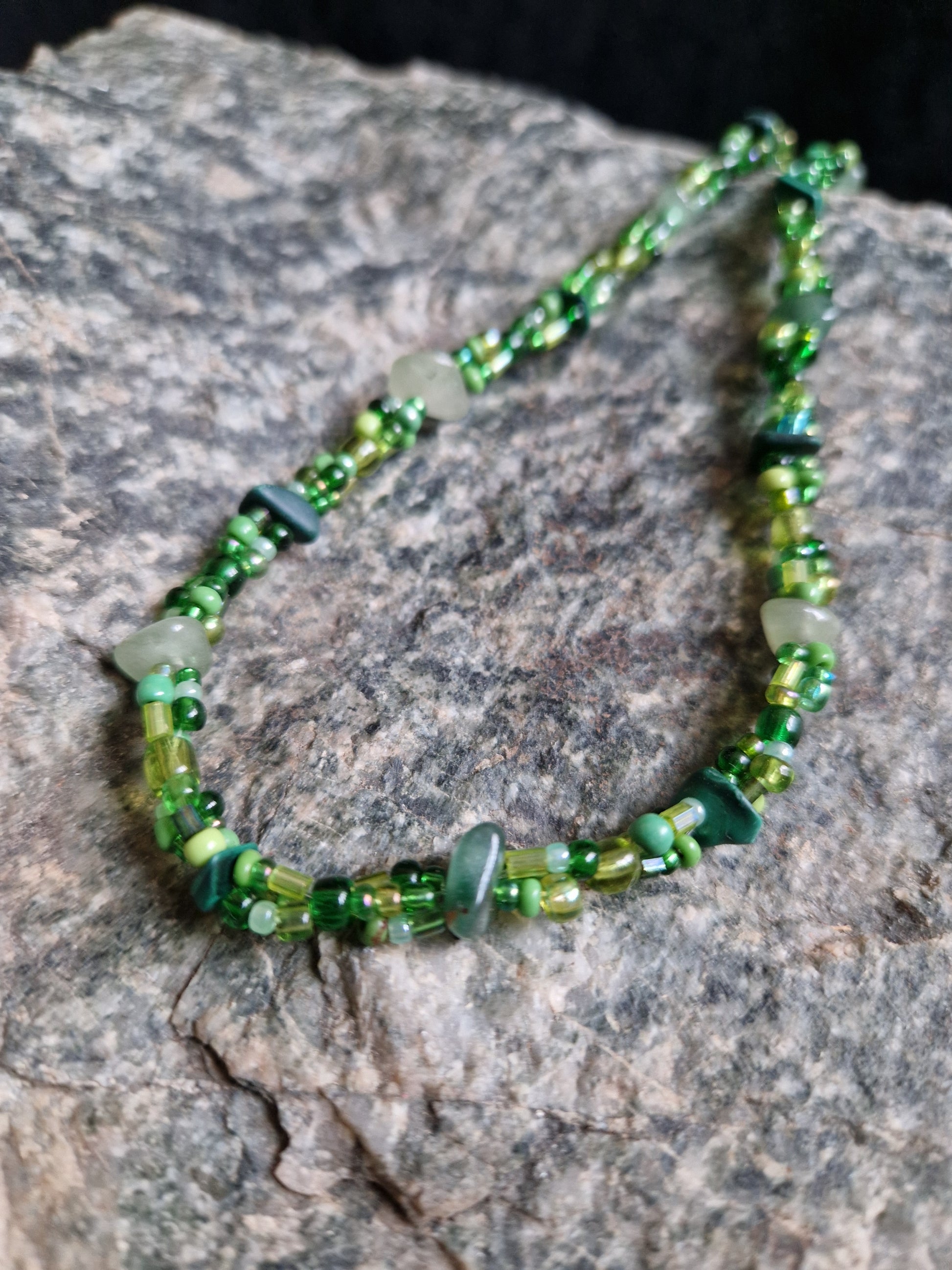 This unique necklace combines over 500 individually threaded glass and plastic beads with malachite and green aventurine stone chips.