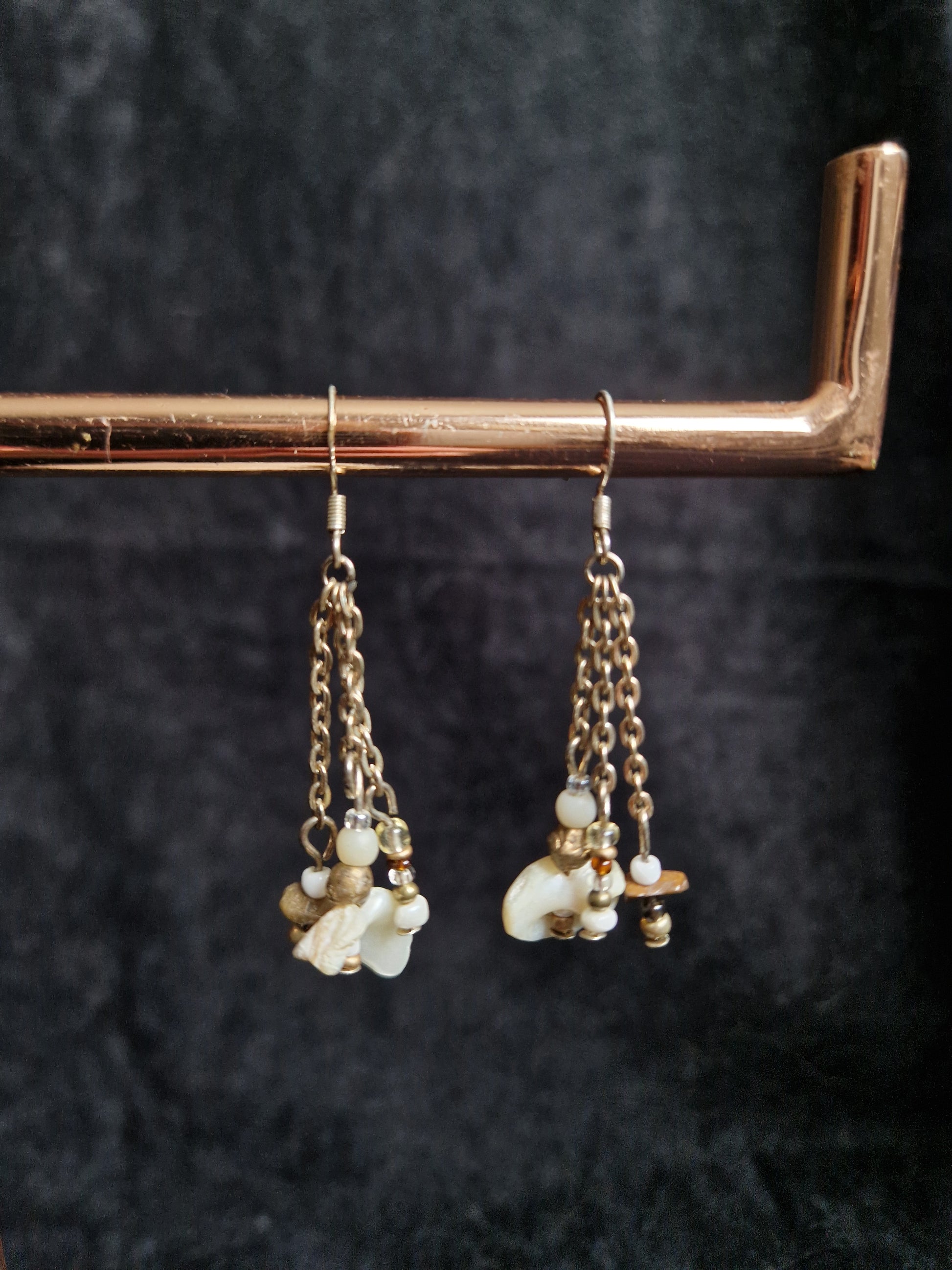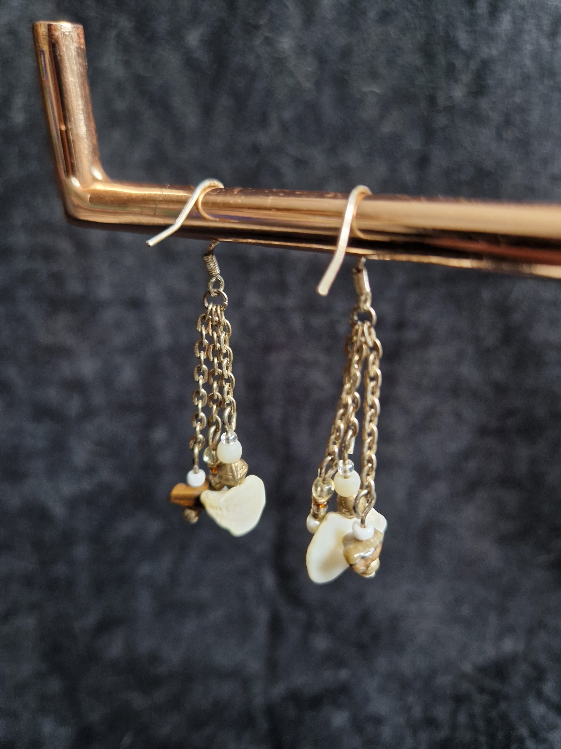 Unique natural dangly earrings made with a selection of glass, shell and plastic beads with tigers eye stone chips on triple strand chains with silver earring hooks.