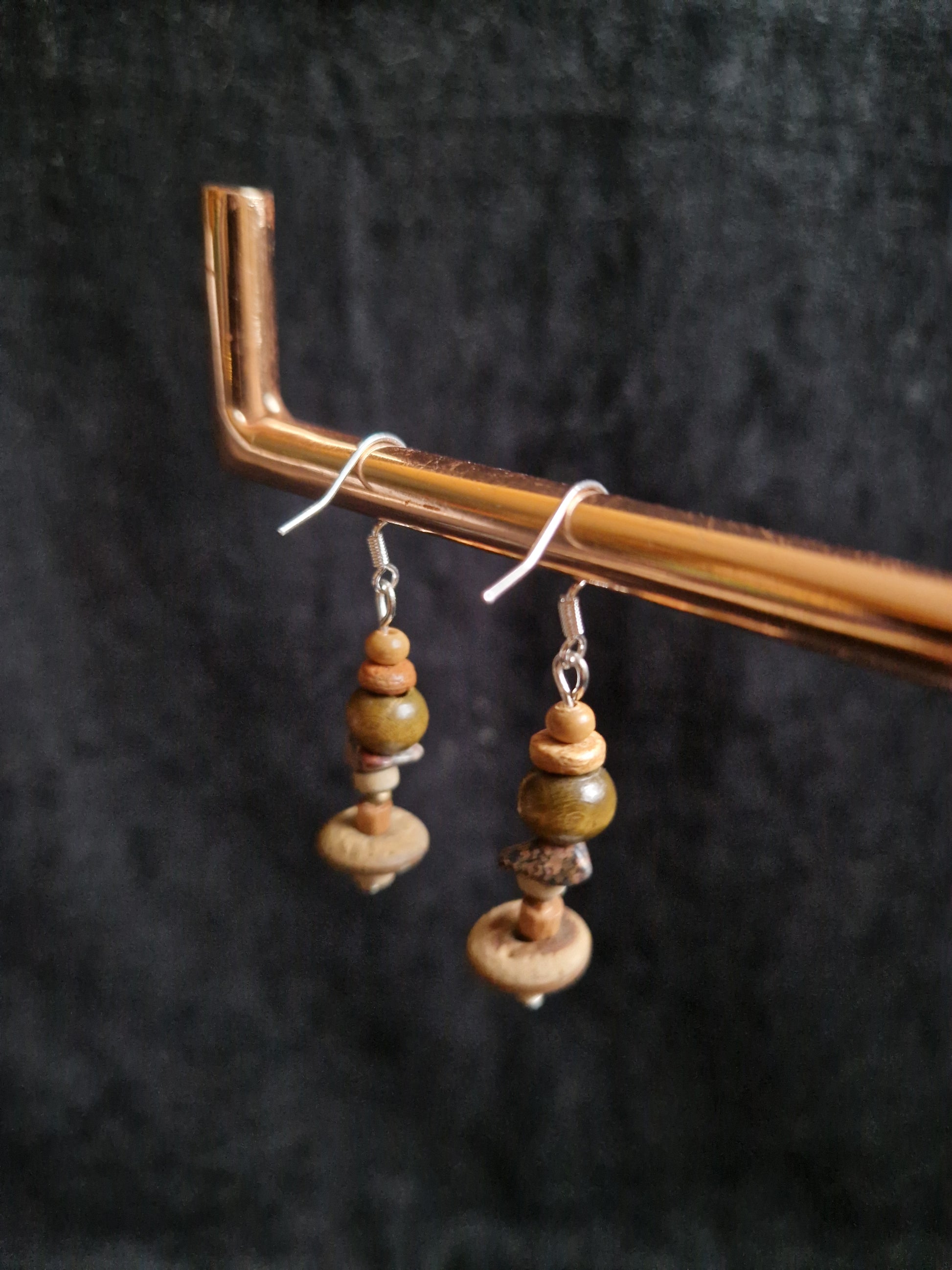 Unique natural dangly earrings made with a mixture of wood beads and pink zebra jasper stone chips on silver earring hooks