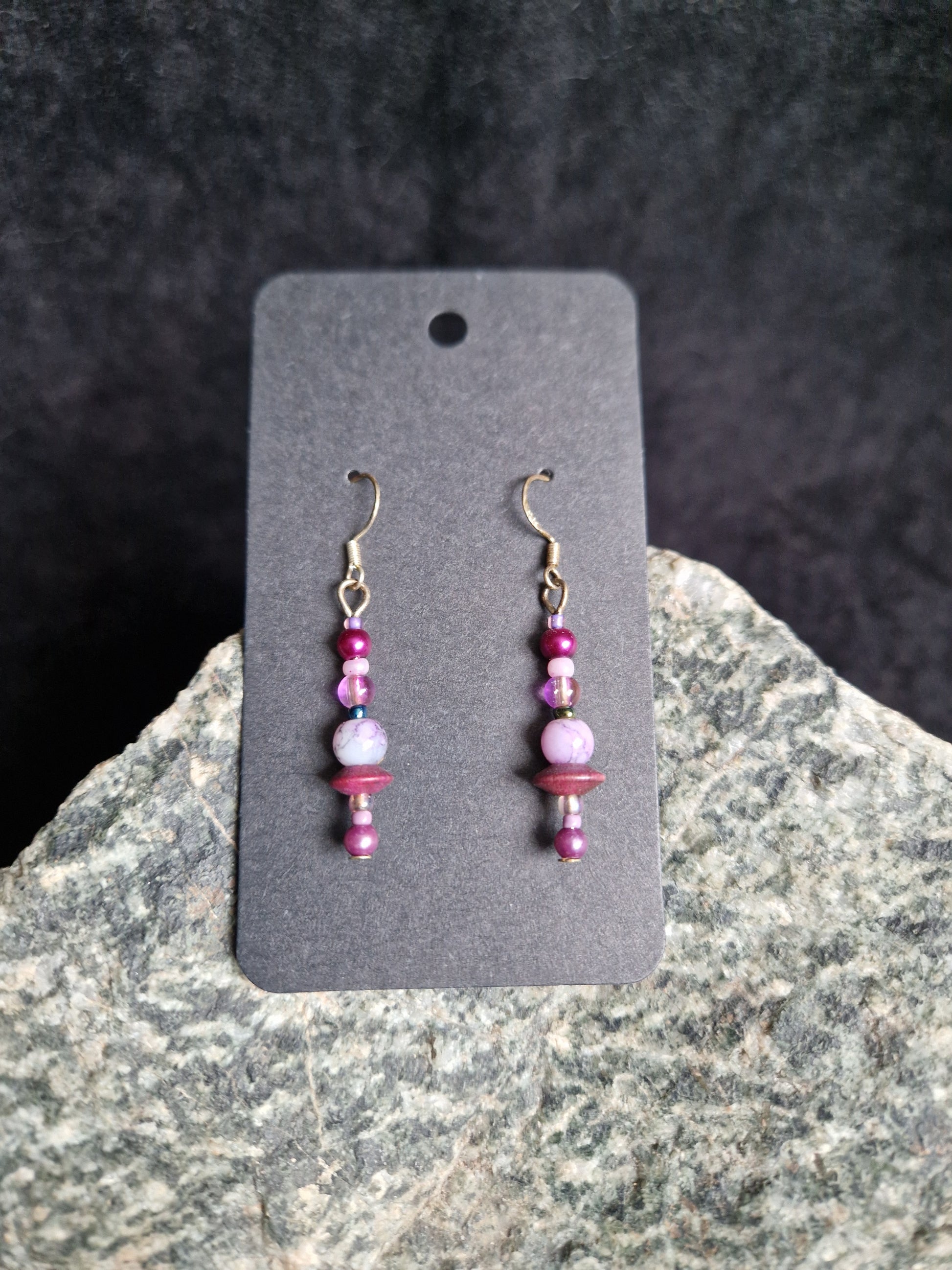 Unique purple dangly earrings made with a selection of glass, wood and plastic beads on silver earring hooks.